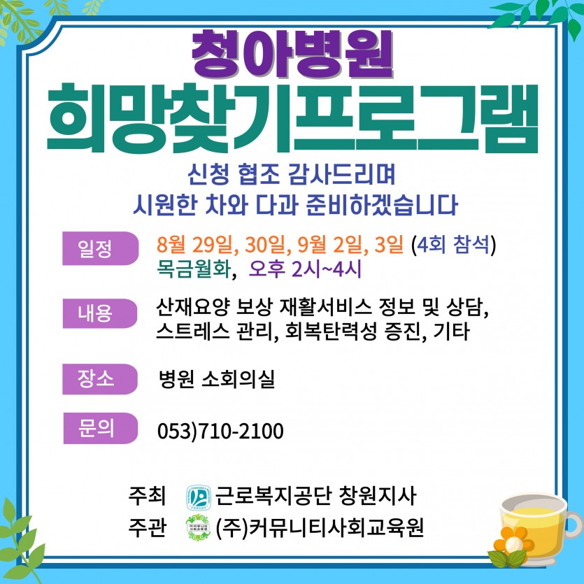 2024년 청아병원 산재근로자를 위한 희망찾기프로그램을 진행합니다.