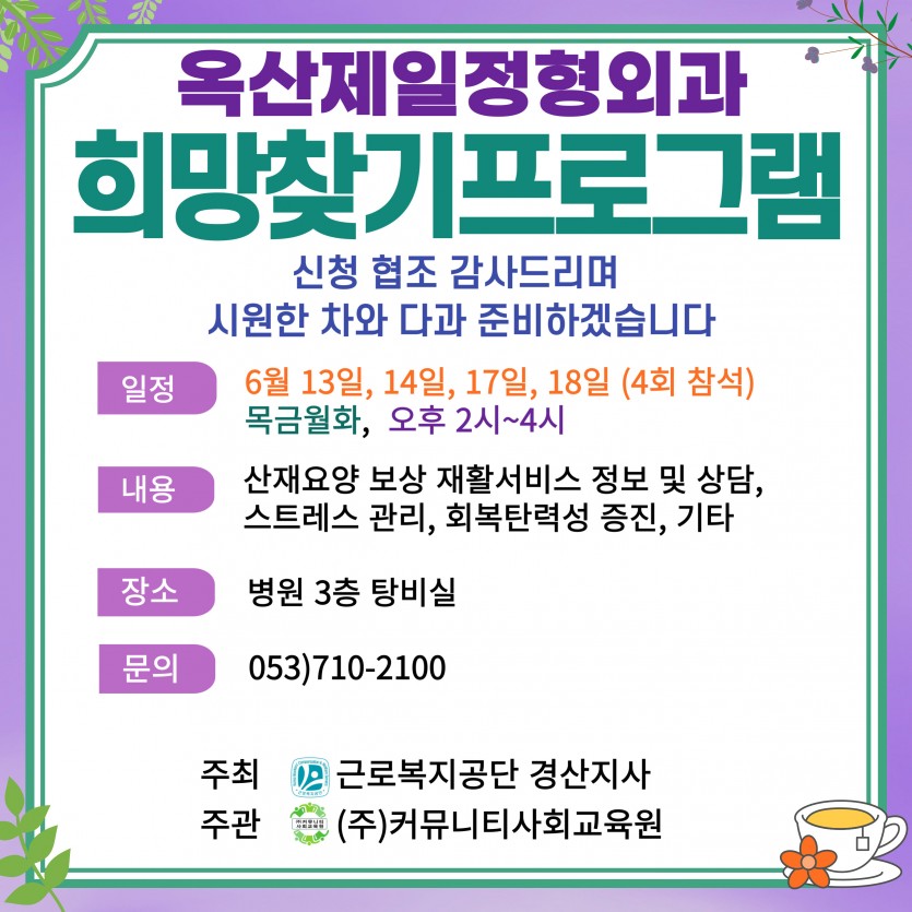 2024년 경산 옥산제일정형외과 산재근로자를 위한 희망찾기프로그램을 진행합니다.