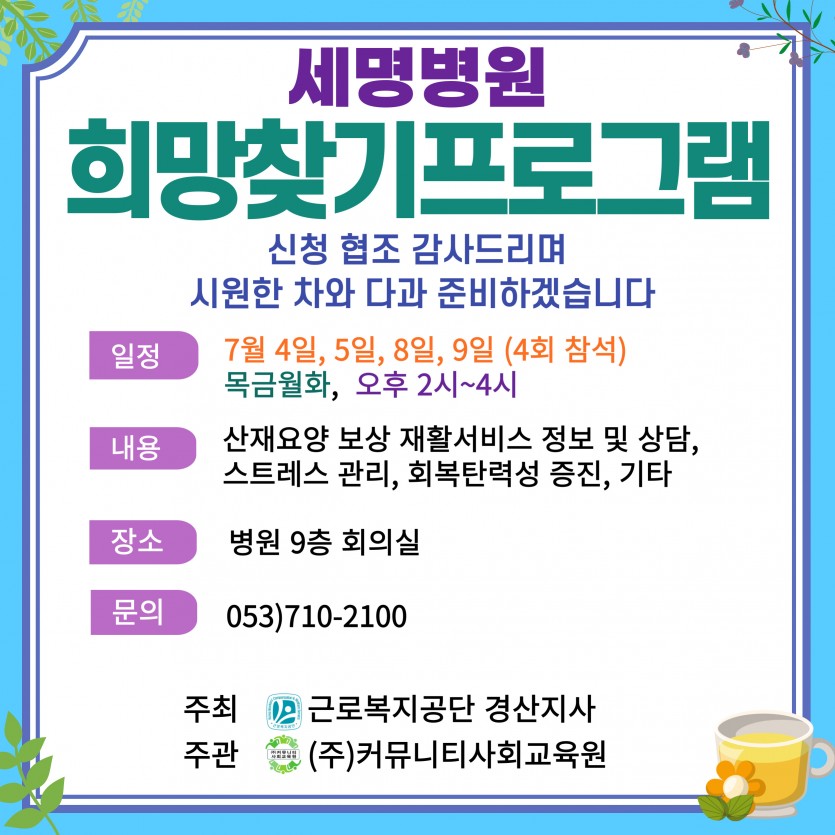 2024년 세명병원 산재근로자를 위한 희망찾기프로그램을 진행합니다.