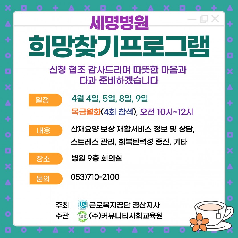 경산 세병병원 산재근로자를 위한 희망찾기프로그램을 진행합니다.