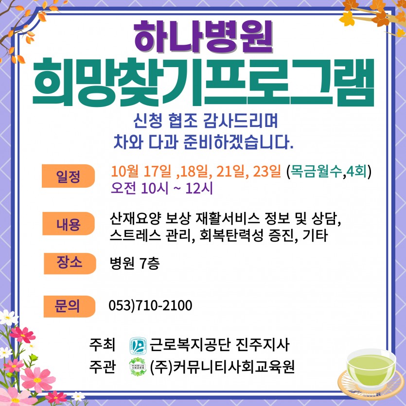 2024년 사천 하나병원 산재근로자를 위한 희망찾기프로그램을 진행합니다.