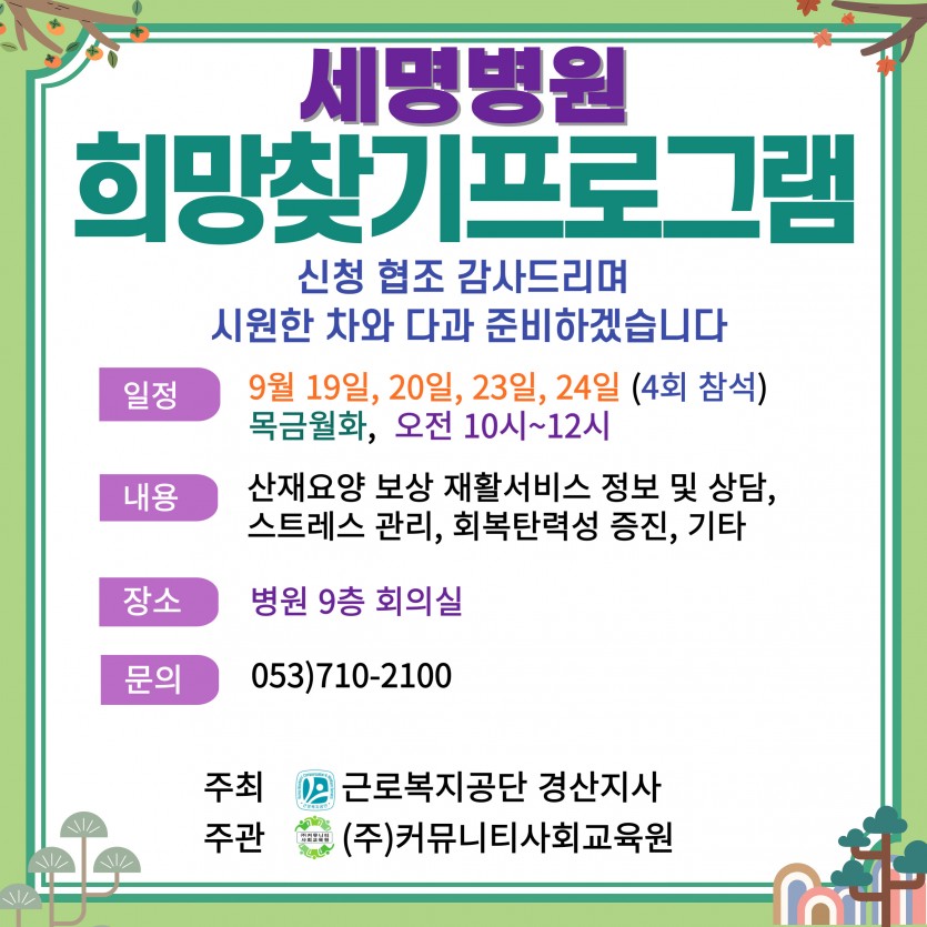 2024년 세명병원 산재근로자를 위한 희망찾기프로그램을 진행합니다.