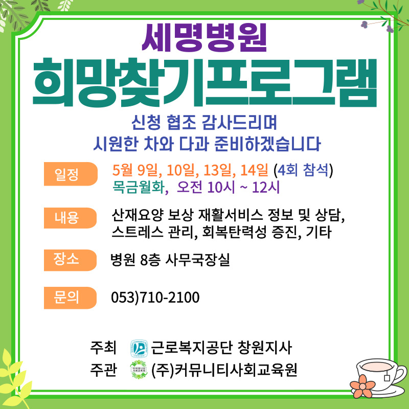 2024년 진해 세명병원 산재근로자를 위한 희망찾기프로그램을 진행합니다.
