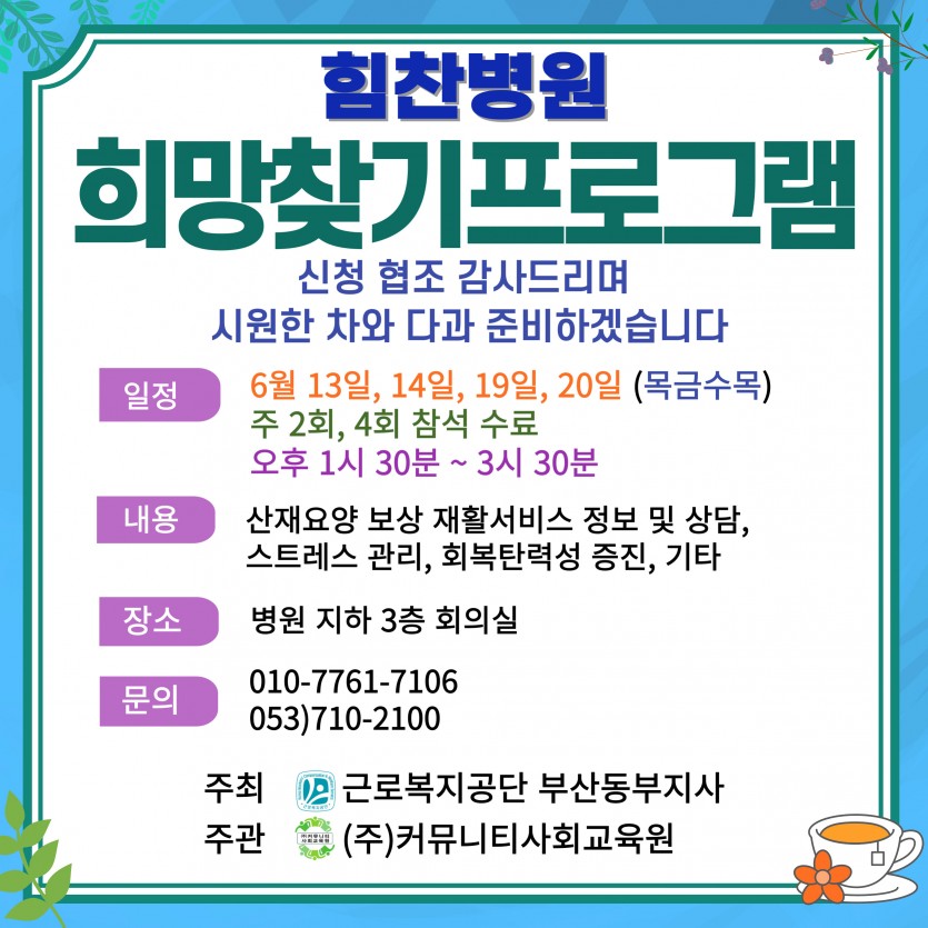 - 다음글2024년 부산 세웅병원 산재근로자를 위한 희망찾기프로그램 안내 24.06.12