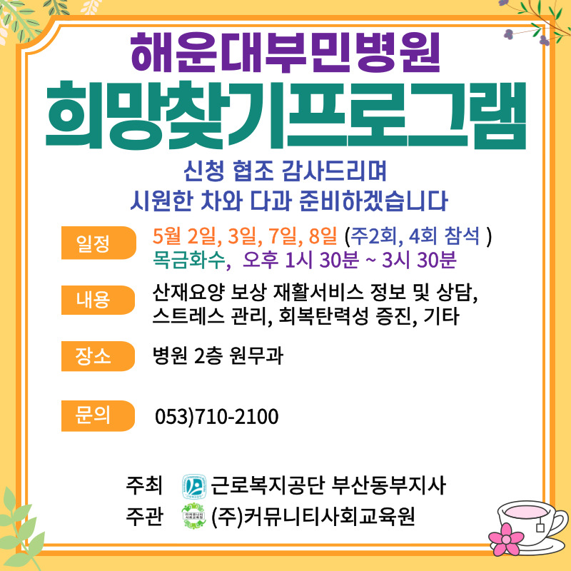 2024년 부산 해운대부민병원 산재근로자를 위한 희망찾기프로그램을 진행합니다.