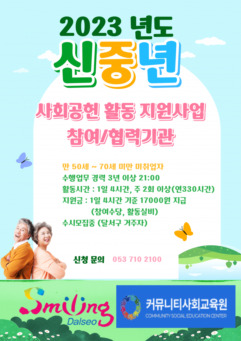 2023년 신중년 사회공헌 사업 수행 페이지 정보 작성자 커뮤니티사회교육원 조회 674회 작성일 23-06-20 14:39 목록 본문 . 이전글커뮤니티사회교육원 납품 물품 카탈로그 23.06.29 다음글2023 근로복지공단 일상복귀서비스(사회심리재활분야) 통합 제공기관 23.06.19